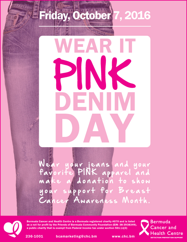Wear jeans with a purpose to take a stand against Breast Cancer! Get your organization or school involved by wearing denim and/or pink! Make a donation and show your support for Breast Cancer Awareness!